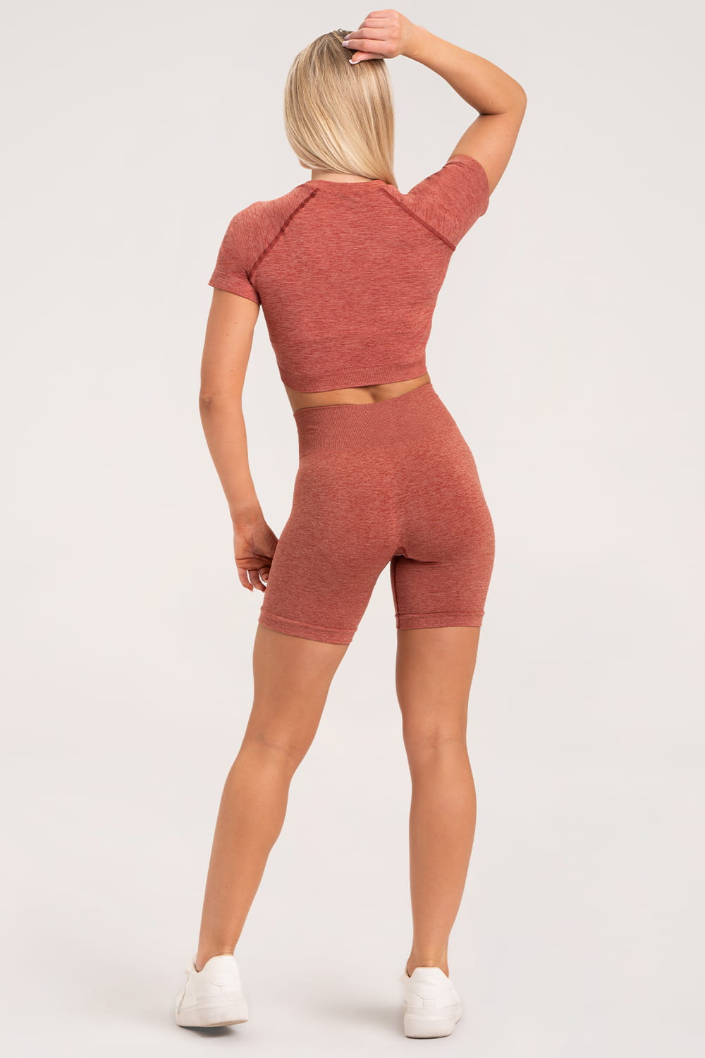 Bezšvové šortky vo višňovej farbe.